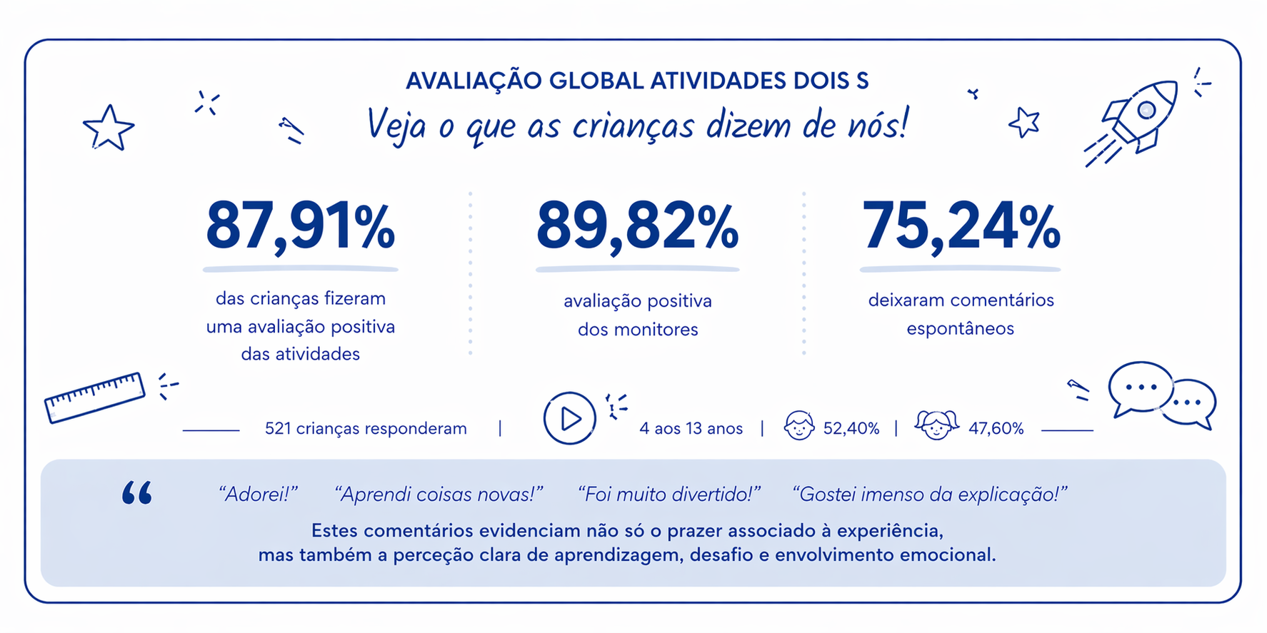 A DOIS S • Play & Learn é um projeto inovador na área da educação, dedicada a crianças e jovens dos 3 aos 18 anos. Criamos experiências que despertam a curiosidade e estimulam o pensamento crítico, a criatividade e a investigação. Através de abordagens lúdico-pedagógicas, exploramos diversas temáticas culturais, científicas e sociais, promovendo uma aprendizagem ativa e significativa.